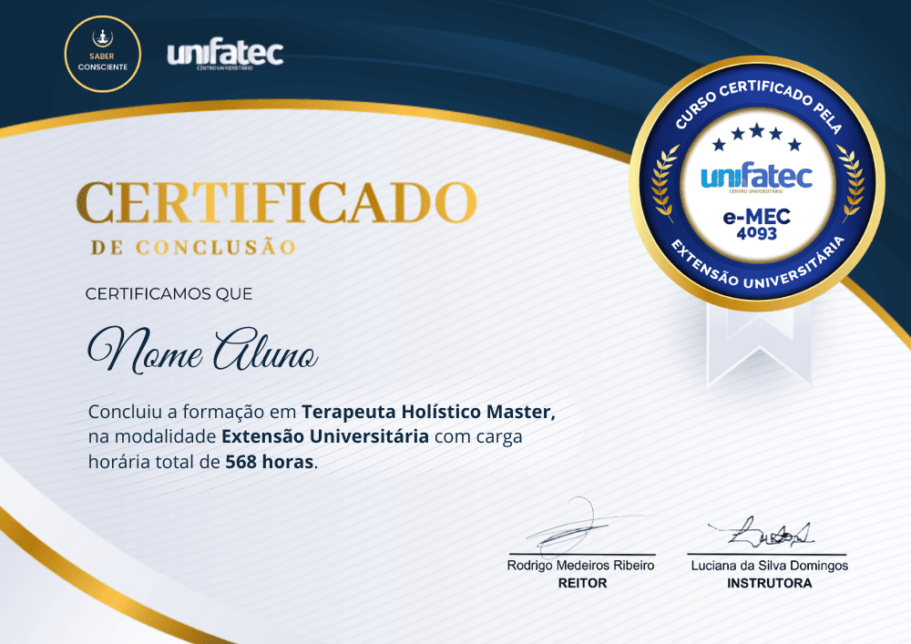Ao concluir o curso e atingir pelo menos nota 60 nas avaliações, você receberá 2 (dois) certificados como Terapeuta Holístico Master, com todas as técnicas descritas. É necessário concluir 100% do curso para solicitar os certificados.