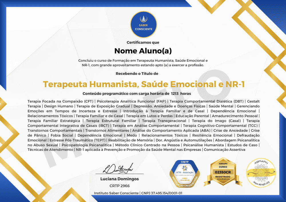 Ao concluir o curso você receberá seu Certificado válido para exercer a profissão em todo país, reconhecido pela Academia Brasileira de Psicoterapia Holística ABRAPH e Associação dos Terapeutas ATH.