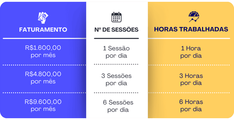 Confira na tabela abaixo uma projeção da remuneração inicial que é possível atingir trabalhando como terapeuta.